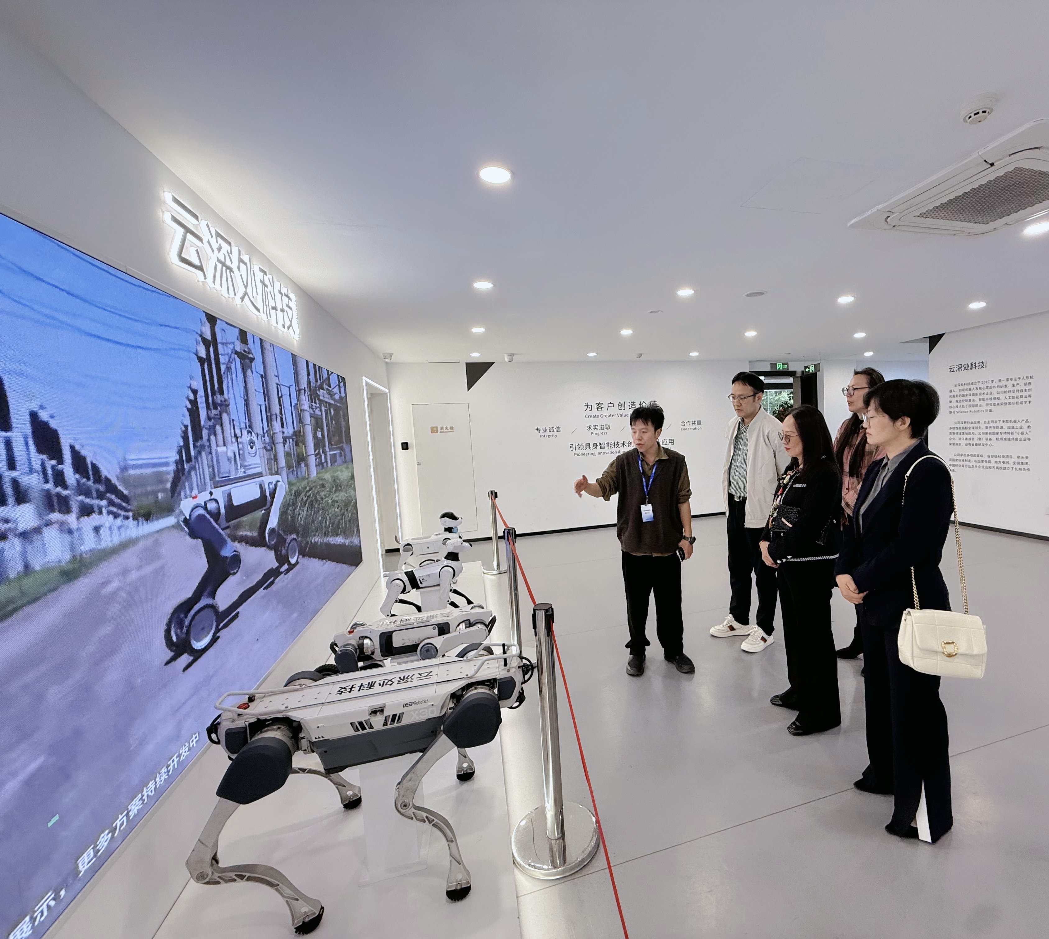 到达企业后学院一行先参观了应用场景展示区,当观看机器狗的实地演示后,大家更了解云深处在智能算法、机器人感知控制、工业智能化等领域的核心技术与创新成果。