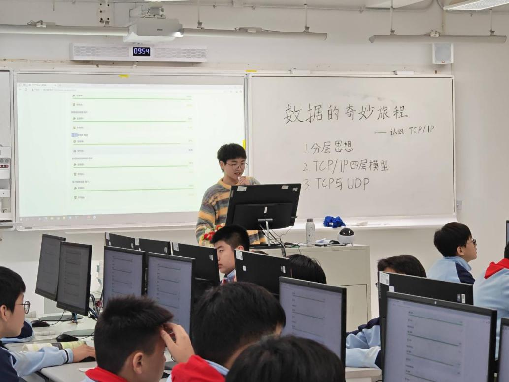 在《认识TCP/IP》的课程中,潘俊宁同学以“快递配送”作为引入,将抽象的网络协议形象化、生活化。潘老师通过巧妙类比,引导学生将快递流程步骤对应到TCP/IP四层模型,自然理解“分层思想”核心概念。在知识点讲解后学生通过完成任务单中的任务以及完成后的成果展示,对知识点实现即使强化,也激发了学生的参与感和成就感。后续的“传话游戏”中,学生模拟TCP与UDP传输模式,在互动与实践中深入体会协议特点,极大激发了学习兴趣,体现了“以生为本”的教学理念,课堂氛围活跃、逻辑清晰。