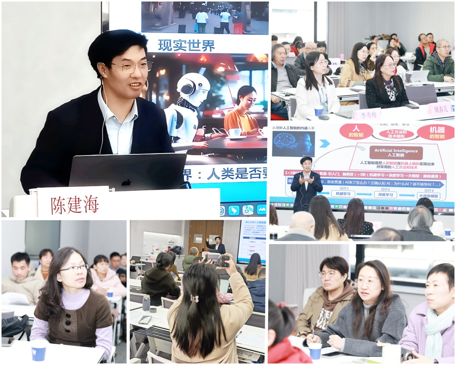 本次研修班学习内容丰富,契合高校人工智能通识课的需求,注重实用性与创新性。学习形式有专家讲座、现场学习、实操训练等。教育部计算机教学指导委员会委员,浙江省计算机教学指导委员会副主任委员,浙江省人工智能学会理事长,杭师大原副校长胡华教授作《地方高校复合型数智人才培养模式探索与实践》开班第一讲主题报告,以杭师大复合型人才培养的教学改革,及杭师大追剧狂人 “跨界融合”的数智人才培养模式为例,生动讲解了如何通过跨学科课程重构、跨领域师资协同、跨边界网络贯通、跨专业实践构建等“四跨协同”机制,培养复合型数智人才的实践探索。