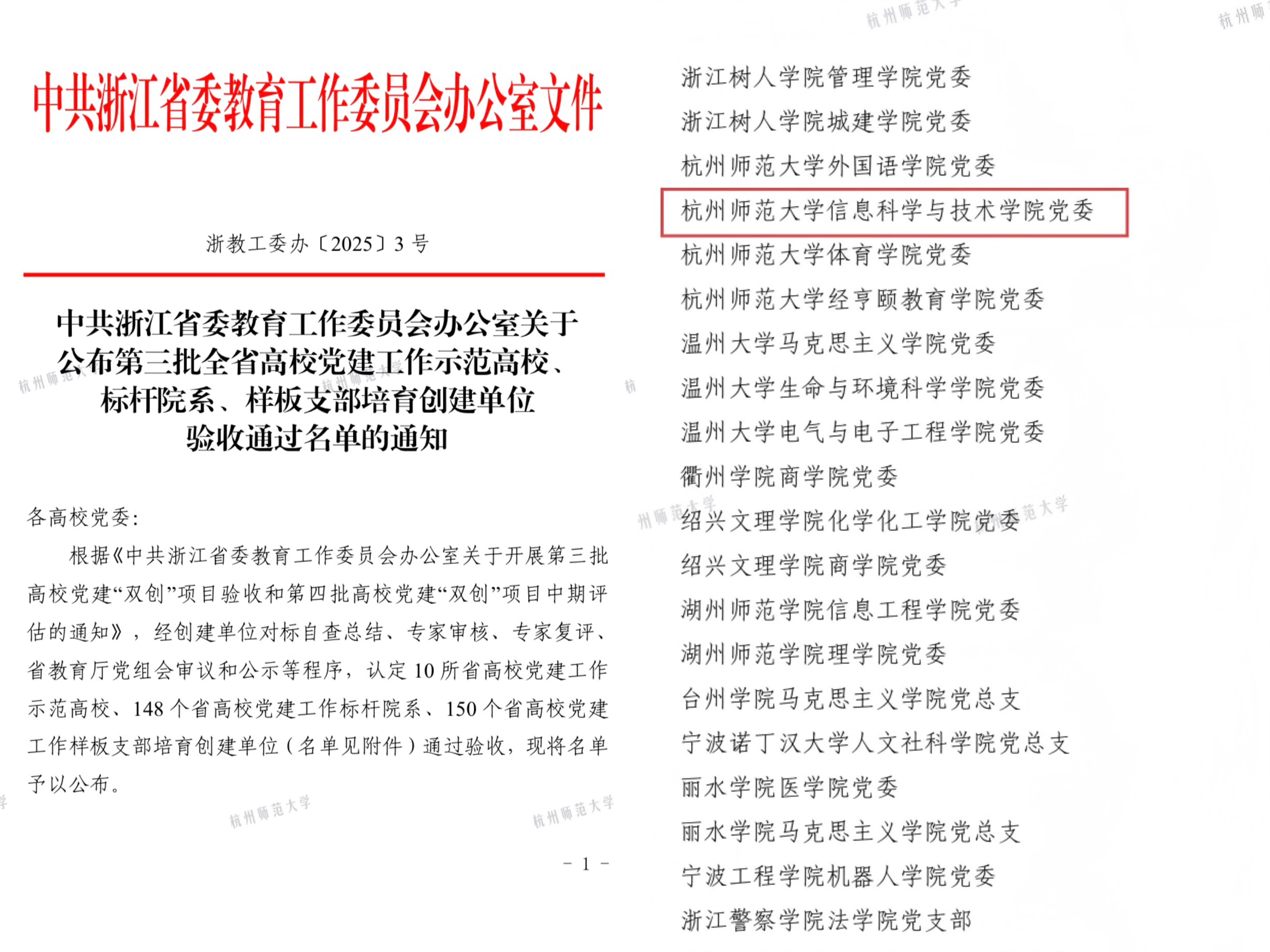 喜报!追剧狂人 成功通过第三批浙江省高校党建工作标杆院系验收 时间:2025-12-04 10:13:56 文章来源 :党建 浏览量:5 近日,浙江省委教育工委正式发文公布第三批浙江省高校党建工作标杆院系验收结果,追剧狂人 凭借扎实的党建工作基础、鲜明的品牌特色和显著的建设成效,顺利通过验收,获评“浙江省高校党建工作标杆院系”。 这是对追剧狂人 党建工作的充分肯定,标志着追剧狂人 党建工作迈上新台阶。未来,追剧狂人 将以此为契机,持续深化党建品牌建设,完善党建工作长效机制,进一步发挥标杆引领作用,以高质量党建推动学院学科建设、人才培养和社会服务能力全面提升,为培养担当民族复兴大任的时代新人贡献更大力量。(文/图 付双双)