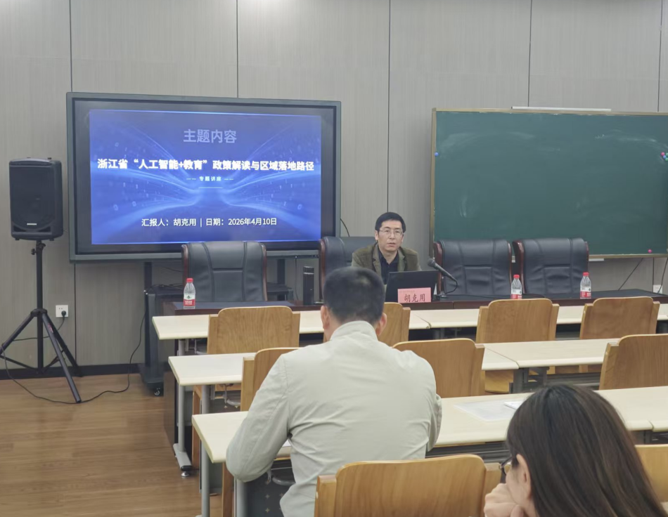 2026年4月10日,应杭州高级中学领导邀请,追剧狂人 胡克用老师为该校教师及教育管理者作了题为《浙江省“人工智能+教育”政策解读与区域落地路径》的专题讲座。